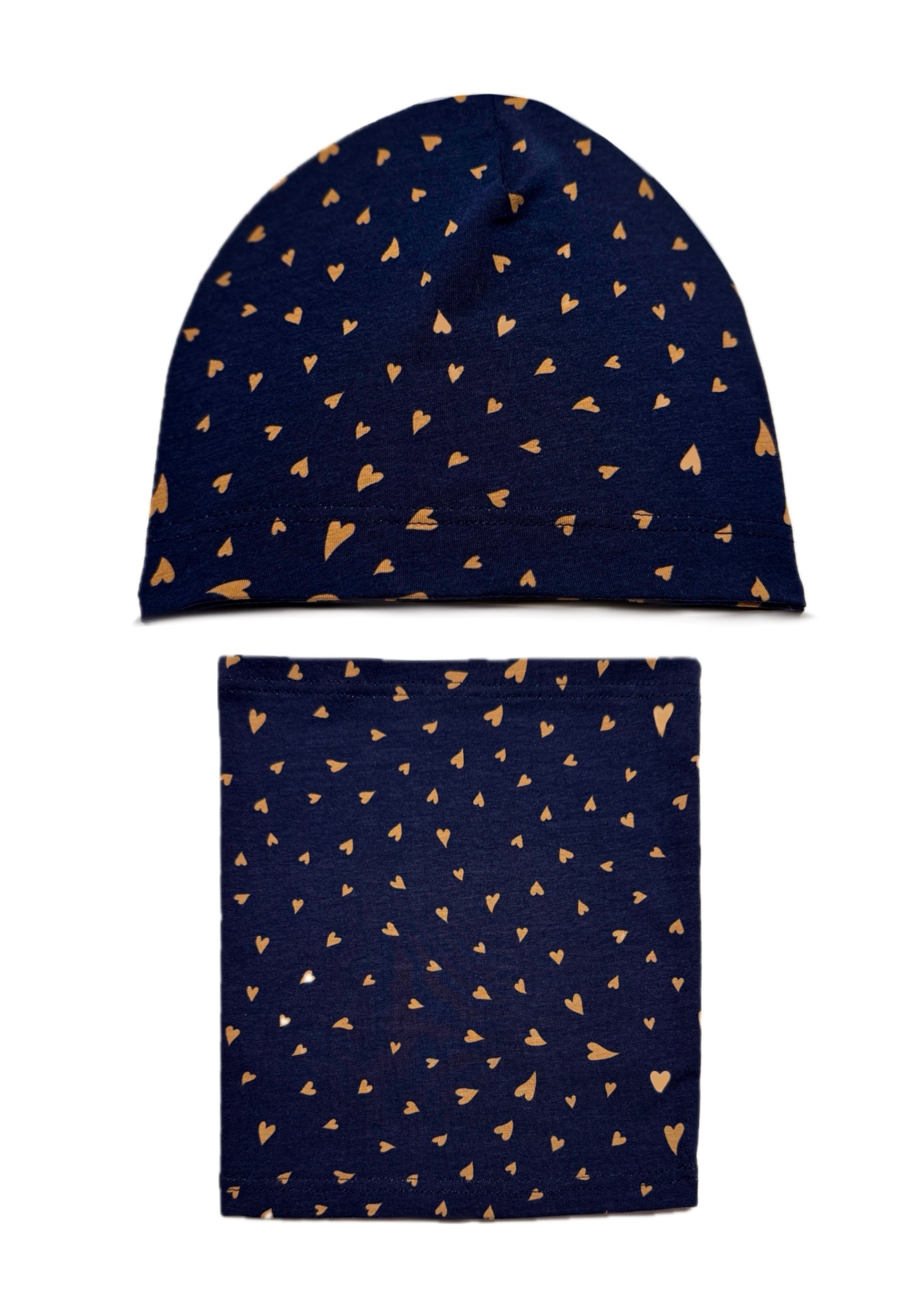 HEART FLOW SET - Kék Szív Mintás Pamut Lány Beanie Sapka és Csősál Szett
