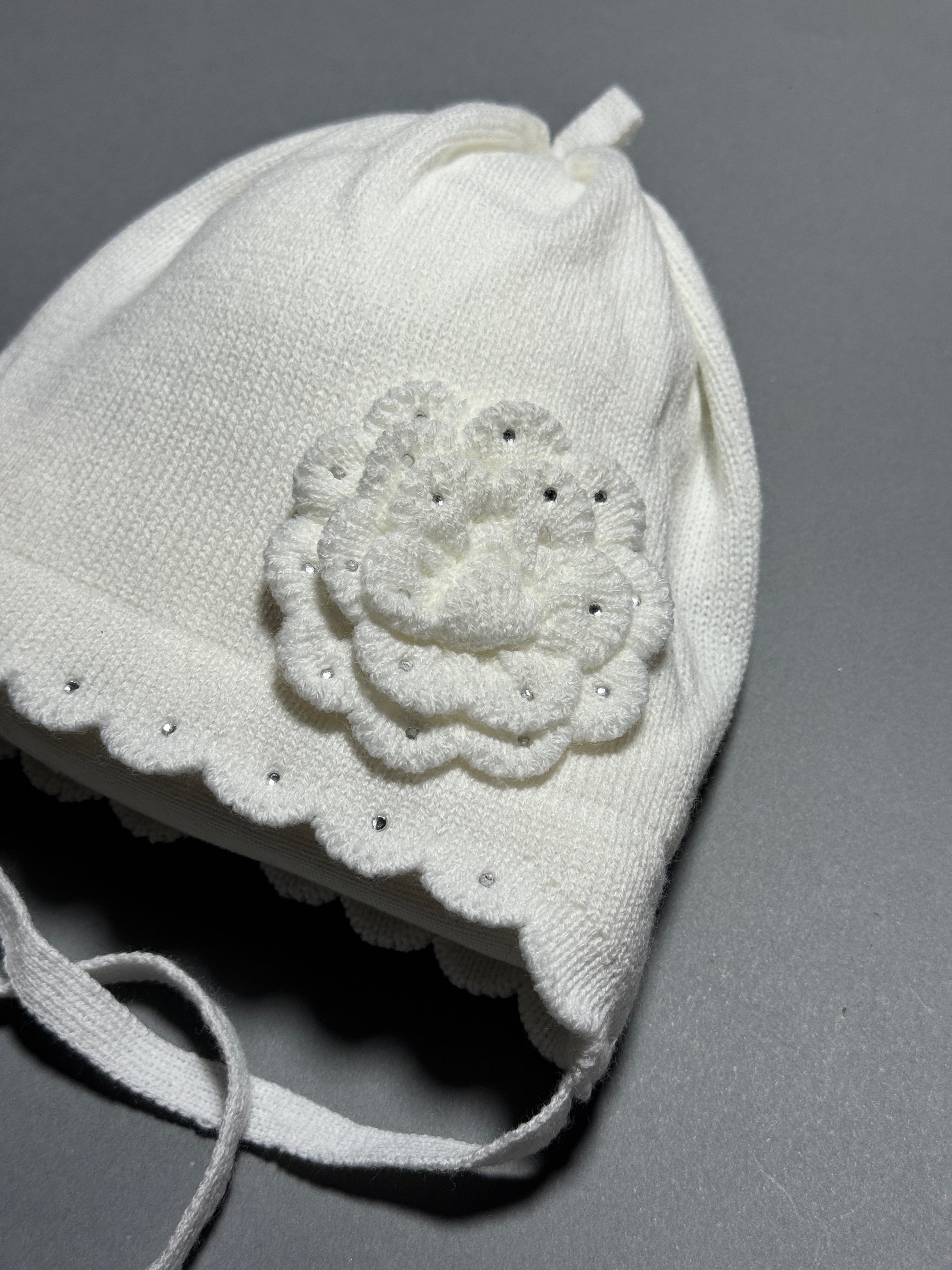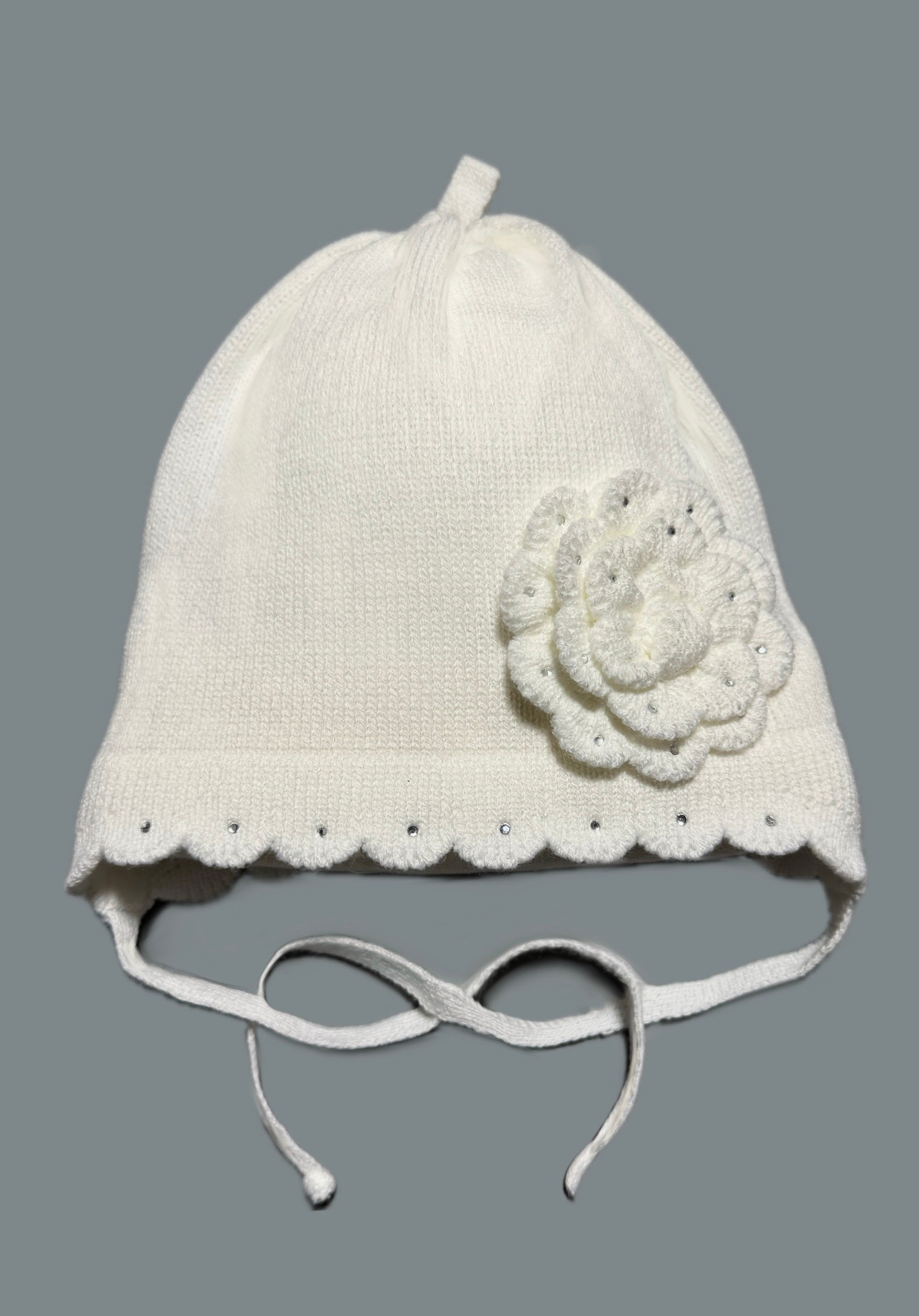 ROSE DIAMOND - Fehér Kötős Strasszos Rózsás Kötött Lány Sapka